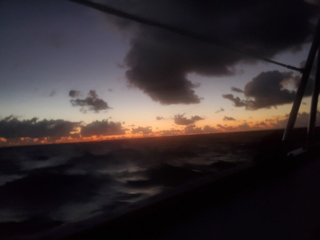 My apologies for the quality of this photo, or I should say lack of photos in general this time. This is the only one we captured during our crossing. Even though it isn’t the best image, you can still make out some of the waves as the sun was setting. Not too bad, and totally manageable.