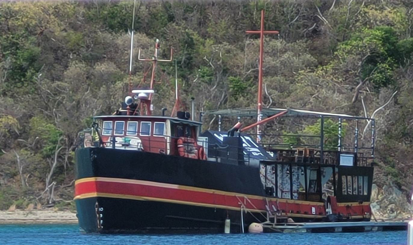 Next on our list was to have some fun at Willy T’s, the pirate ship/floating bar and grill anchored at Norman Island. Sadly, the original Willy T suffered significant damage during hurricane Irma, and has since been turned into a pirate-y dive site. At the time of our visit, we didn’t know about the former vessel’s new life, or we would’ve happily taken the time to explore it. (next time we will!) We had a fabulous time enjoying lunch on the new Willy T, and joining other travelers as we conscientiously followed all posted rules…LOL!